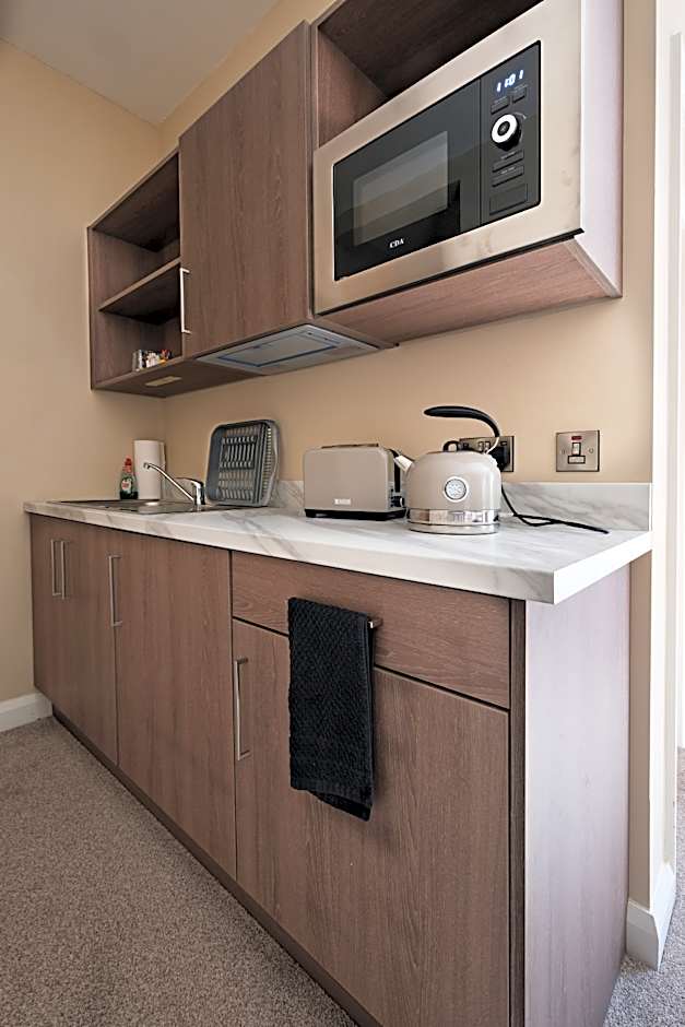 Offering free toiletries, this double room includes a private bathroom with a shower and a hairdryer. In the kitchenette, guests will find a refrigerator, kitchenware, a microwave and a tea and coffee maker. The double room features carpeted floors, a seating area with a flat-screen TV, a dining area, a wardrobe, as well as heating. The unit offers 1 bed.